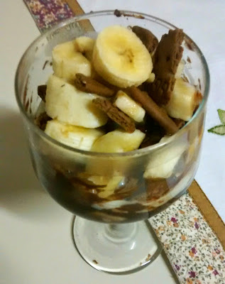 Em uma taça ou em algum pote, coloque uma camada de alguns pedacinhos de bolacha, aí uma camada do creme de avelã com creme de leite, aí coloque as bananas picadas, mais uma camada do creme, mais uma camada de bolacha, e repita até que encha a taça. Lembrando que não são camadas grandes, para não ficar enjoativo.